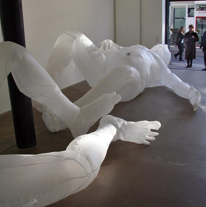 Nylon spinnaker, electric blowers, flexible duct; each figure 5 meters tall.